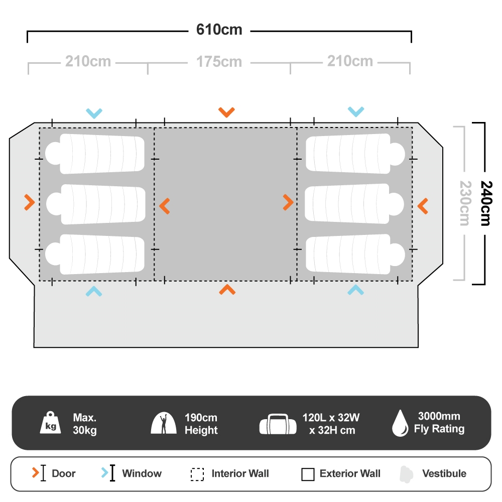 You can set up the inner in just 3 minutes no matter how frazzled you are, as the Instant Northstar has an instant-up frame – so it’s ready to go straight out of the bag. Then you can just chuck on the fly, peg it out and you’re good to go. For illumination at the flick of a switch, the interior has silicone flexible strip LED lighting which is super convenient. Bonding with the family is important, but you still need some privacy to keep your sanity. This tent features 3 rooms separated by zippered mesh and privacy doors – so you can spend time together and have some personal space.