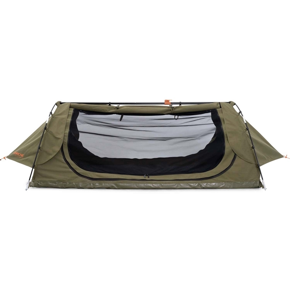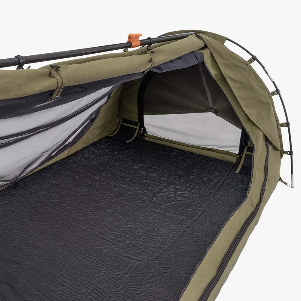 Brave the brutal outback winters with vents at both ends featuring large storm flaps, while a heavy-duty PVC bucket floor provides protection from the sodden ground. The 420gsm proofed rip-stop poly-cotton canvas blankets the full-length superfine mesh, representing a bush-bashing blend of durability and versatility in any weather condition. Plus, zippers inside allow access to the vestibule space above the head. For a steadfast structure, the sturdy composite poles either end offer a fixed, freestanding solution – so you can free-fall into dreaming. This design also features two large entrance points that roll open for a full, unimpeded view of the moonlit landscape – and stretch out in your outback hangout atop a high-density foam mattress boasting seven centimetres of height, for cushioned comfort that caters for all bodies and builds.