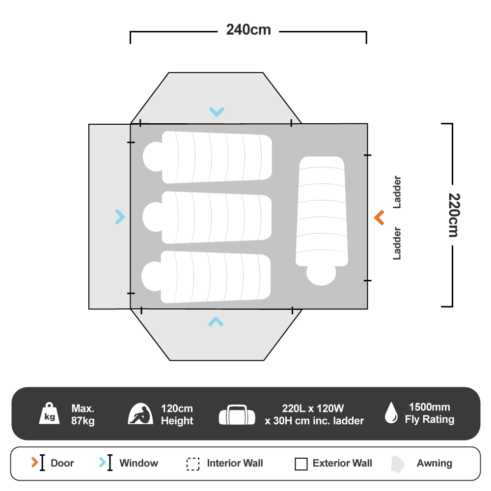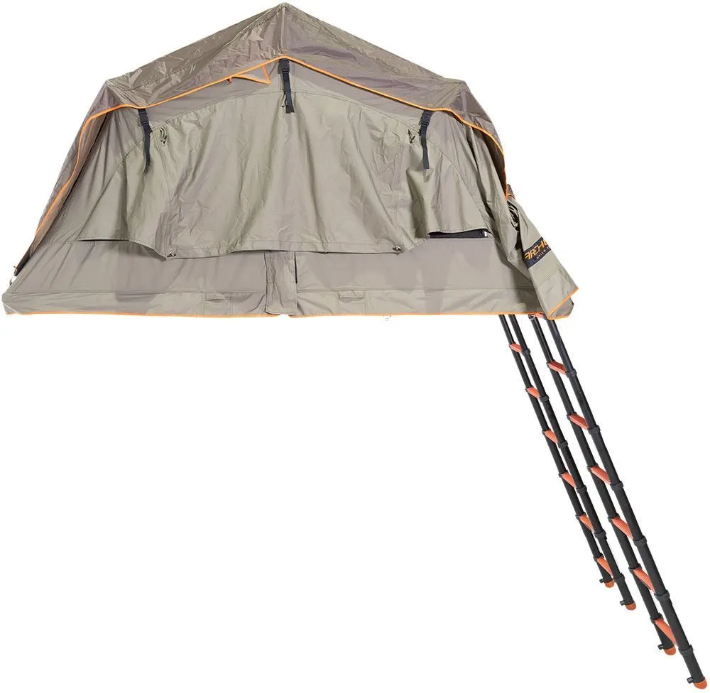 This RTT made from fully seam sealed 260sgm polyester/cotton ripstop canvas for durability on your expeditions, with a sturdy internal aluminium frame for structure. With two entry points and telescopic alloy ladders, you can access this shelter easily, and it has an adjustable tropical fly to help prevent condensation. Check out the heavens through the two star gazing windows, keep out insects while enjoying the scenery from the large full-width side windows, and get fresh air through the built-in air vents.