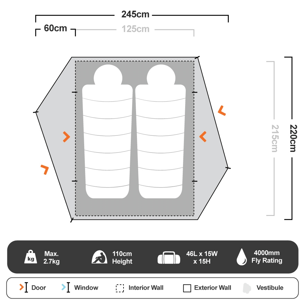 The Doors have No-see-um mesh, so you will get plenty of ventilation inside your space. The Spartan 2P is perfect for the solo hiker or couple on a budget.