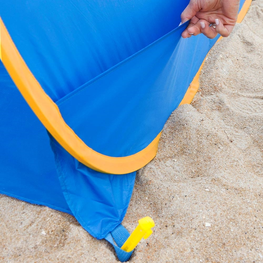 Also featuring a durable non-corrosive spring steel frame, this pop-up beach shade includes pegs and a sandbag anchor for stability and has built-in sand and storage pockets for keeping small items at hand. And it’s as easy to pack up as it is to set up!