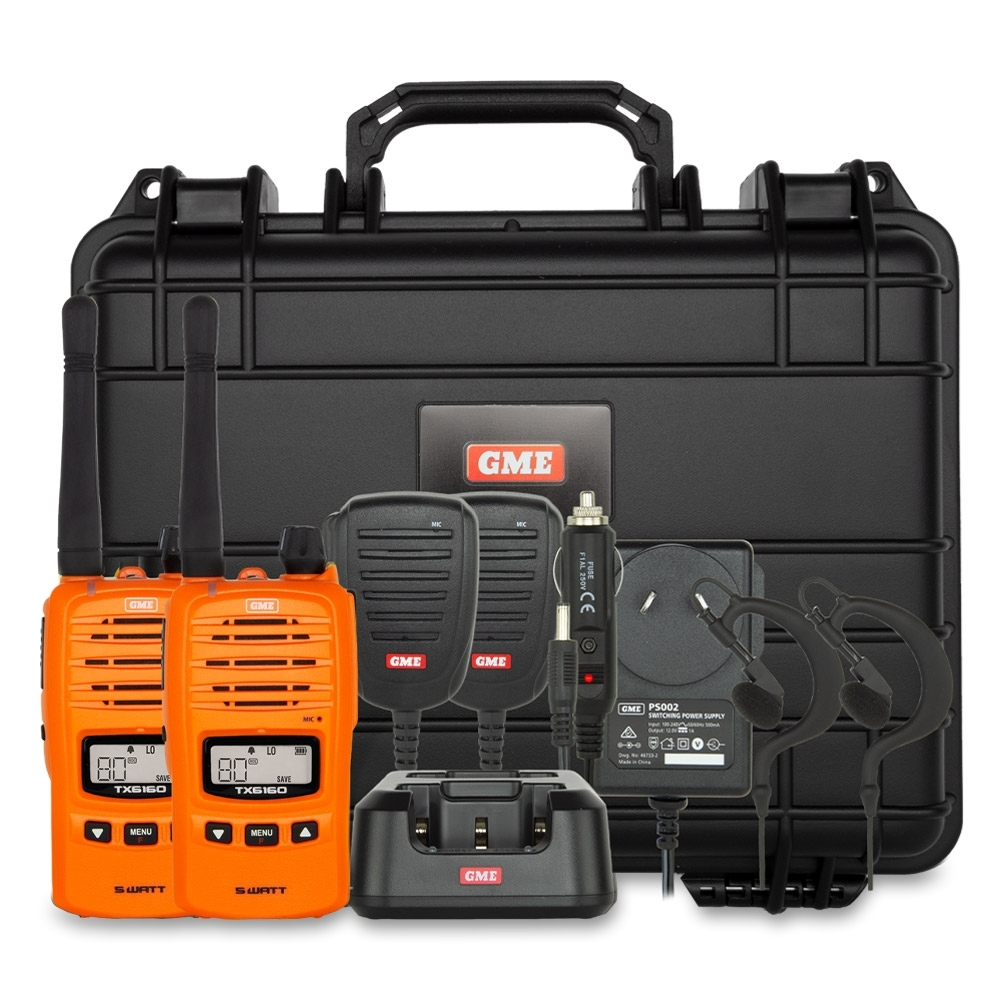 - Includes: 2 x Orange 5 Watt UHF CB Handheld Radios (TX6160XO), 2 x 2600mAh Li-Ion Battery Packs (BP026O), 2 x IP67 Waterproof Speaker Microphones (MC011), 2 x Ear-piece Style Microphones (HS015), Dual Desktop Rapid Charger BCD021), Rugged Carry Case, 12V DC Vehicle Charger (BCV007), AC Adaptor (PS002) & 2 x Belt Clips (MB045)