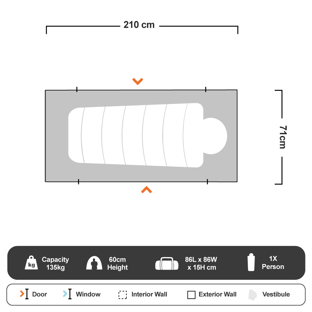 This cot is constructed from heavy-duty nylon with taped seams for protection, and No-See-Um mesh on the windows and doors to keep out insects and allow for ventilation. The heavy-duty powder coated frame is easy to set up and provides stability while you snooze. This elevated design keeps you off the cold or damp ground and has an inbuilt 1cm foam mattress for comfort and warmth on chilly nights. Easy to set up in seconds by just one person, this design also converts into a lounge chair or standard cot for extra versatility.