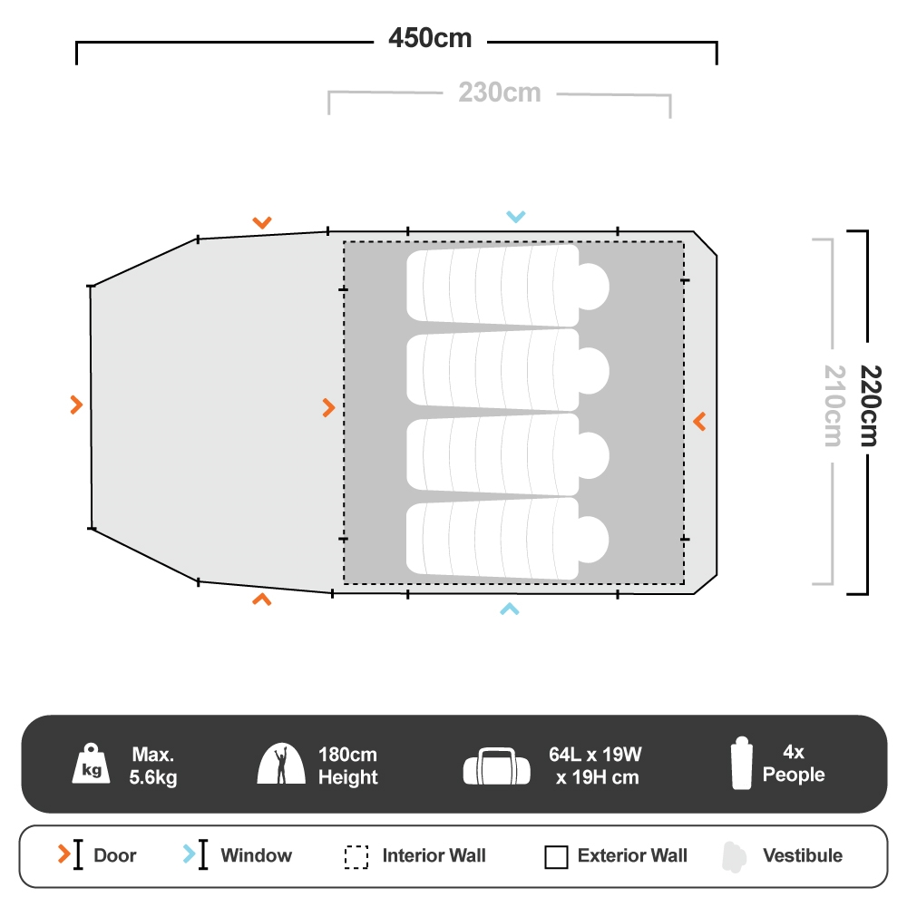 With large front and rear D doors plus a side door on the extended vestibule, this tent offers terrific ventilation to keep you cool and the air circulating. The dome design gives you a full head height of 180cm which continues out to the extended vestibule section, and with easy step doors, organiser pockets and an attachment point for your light, you’ve got total comfort and convenience at your fingertips.