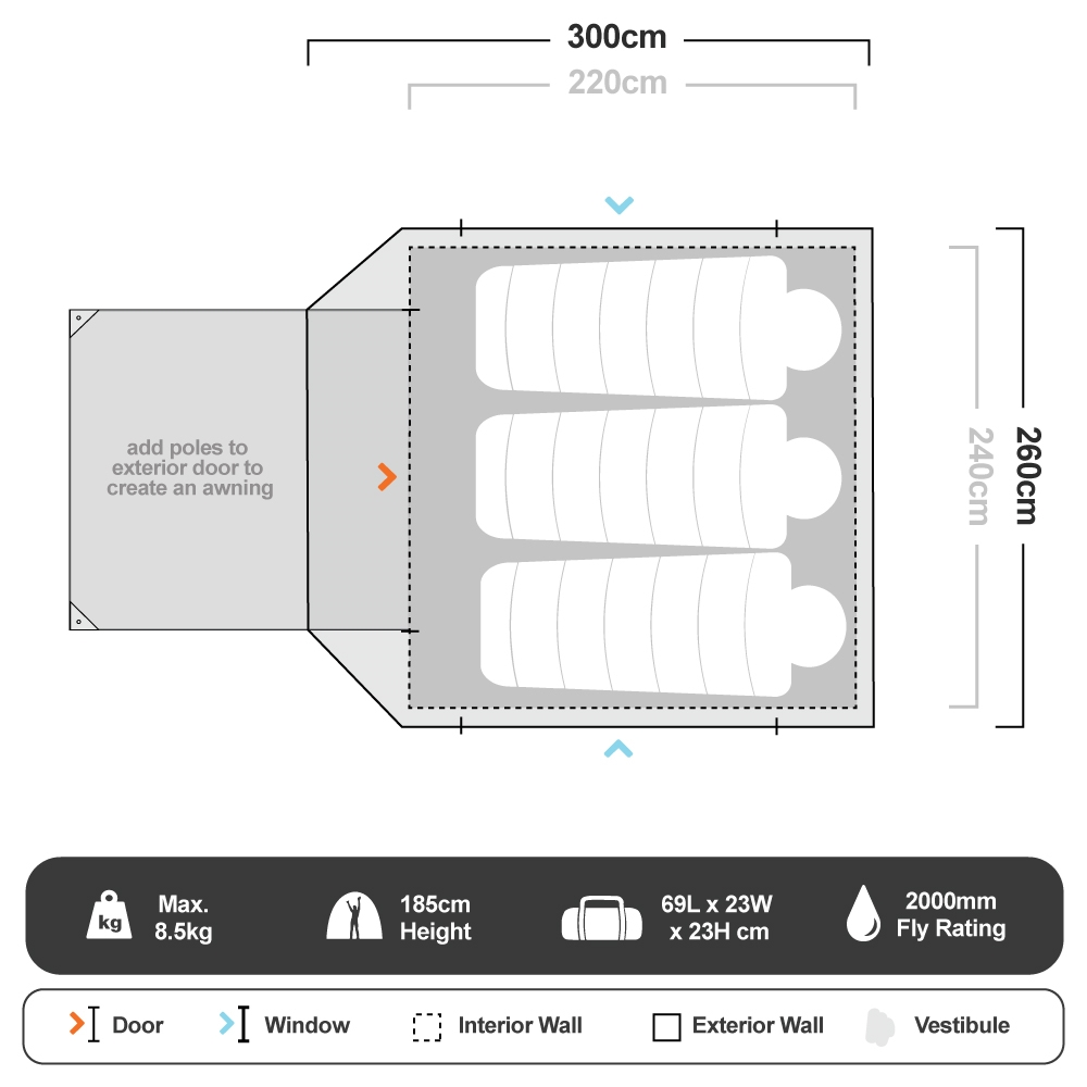 Keep the water out no matter the weather, with fly fabric coated with a multi-pass PU on the inner and a durable water repellent on the outer. Add sealed and inverted seams with welded corners – and you’ve got a full fly shell to keep you and your gear dry for days. Not only does this tent keep the water out, but lets the air in, owing to large side and rear windows with sandfly proof mesh for those hotter days. A large gusseted front awning and oversized front door also adds extra storage space and shade for day-long lounging in complete comfort. It’s tough keeping organised in the outdoors, so keep your camp kingdom clean with plenty of internal storage pockets, plus a power cord entry and management system. If you’ve ever struggled to squeeze a tent back into its bag, never fear – pack away problems are in the past, thanks to the oversized carry bag.